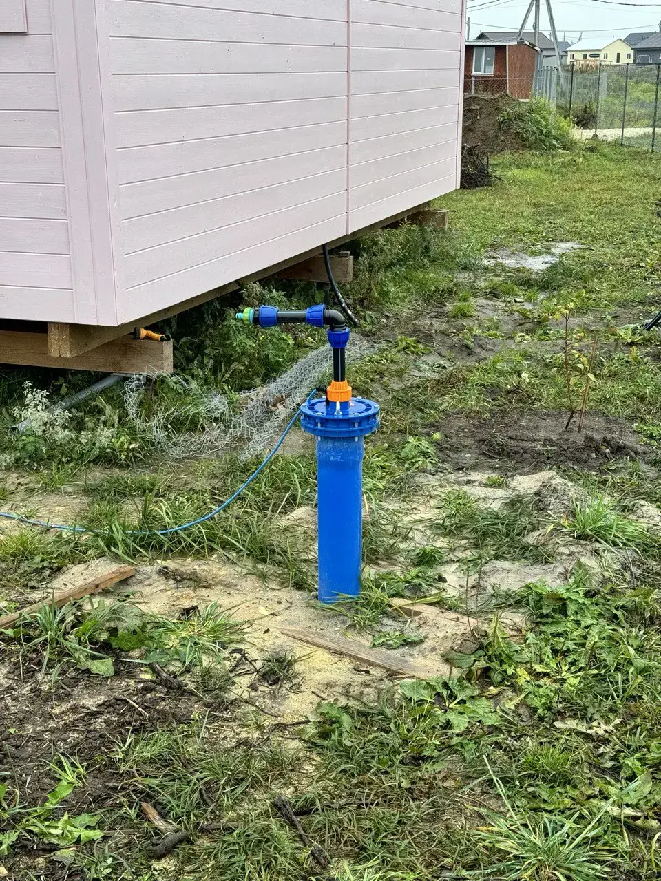 Эту скважину мы пробурили почти год назад, весной 2019 года, в деревне Никитино. Глубина получилась 32 метра, дебит хороший — воды хватает с запасом. Заказчик пользовался ею всё лето с помощью обычного погружного насоса и шланга, но к этому сезону решил сделать полноценное обустройство, чтобы не возиться. Так как дом в Никитино используется только для летнего проживания, а вода нужна в основном для полива огорода и теплиц, мы предложили летний вариант обустройства скважины. Этот способ самый практичный и экономичный в таких случаях — он не требует установки кессона или адаптера, и при этом позволяет быстро включать насос и получать воду прямо на участке.
