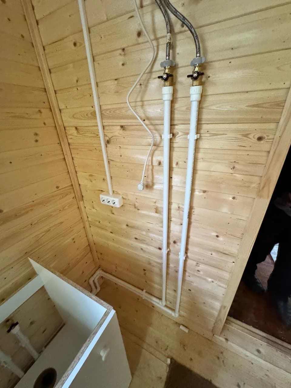 Мы начали с подготовки технического помещения. Установили здесь гидроаккумулятор, подключили автоматику. Чтобы вода поступала чистой, установили магистральный фильтр BB10, который задерживает механические примеси. Это особенно важно для защиты котла и бытовой техники. Затем приступили к разводке труб. Использовали надёжные полипропиленовые трубы, аккуратно проложили магистраль. В санузле сделали выводы для раковины, душевой кабины, унитаза и котла. Все выходы оставили аккуратно подписанными, чтобы на этапе чистовой отделки сантехники монтажникам было легко подключить приборы. Заказчики остались довольны.