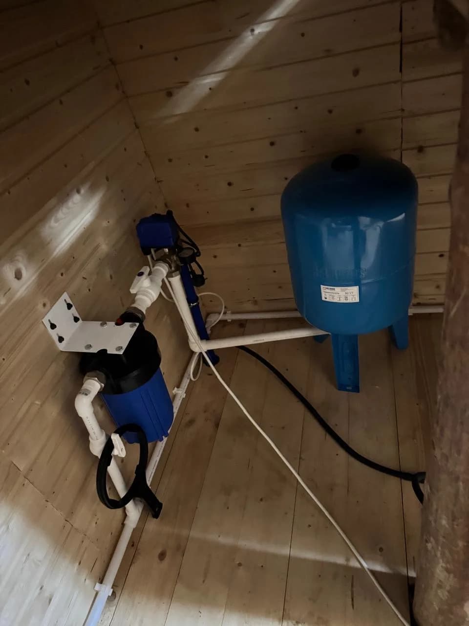 «Установили оборудование для скважины в техническом помещение, смонтировали магистральный фильтр ВВ10. Выполнили монтаж разводки воды для санузла, оставив сантехнические выводы для раковины, душевой, унитаза и котла.»